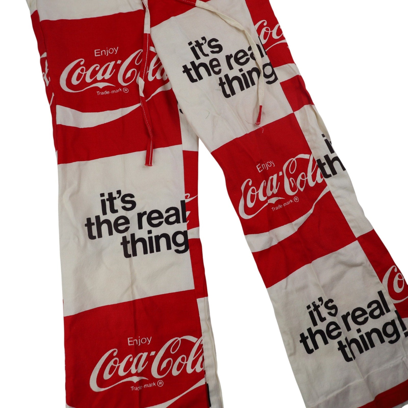 True Vintage 70s Coca Cola All Over Print Draw String Bell Bottom Pants. Overall in beautiful condition, no notable imperfections. No size tag found, please refer to measurements.