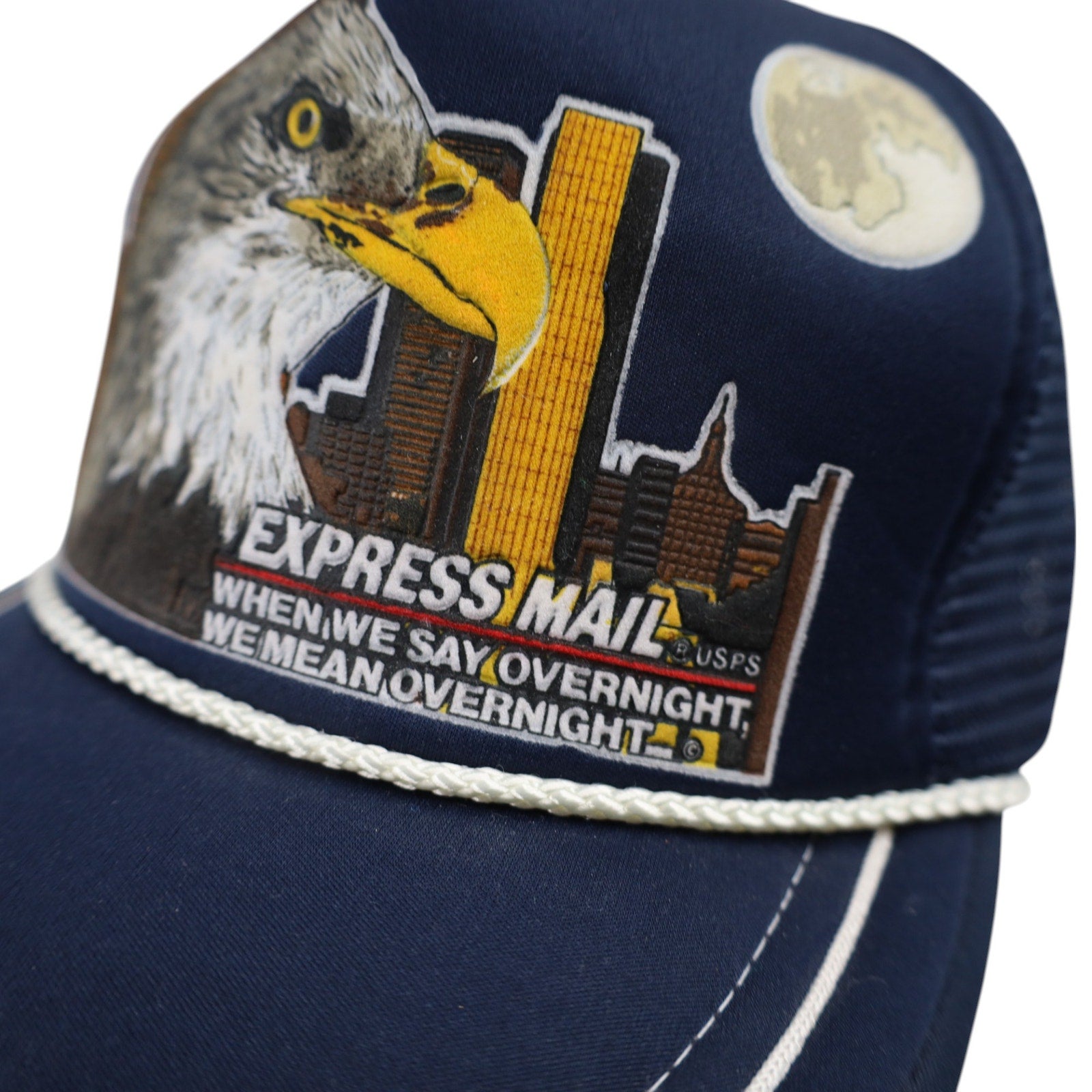 Vintage USPS Express Mail Overnight Bald Eagle Night Scene Trucker Hat. In beautiful condition, no notal imperfections.