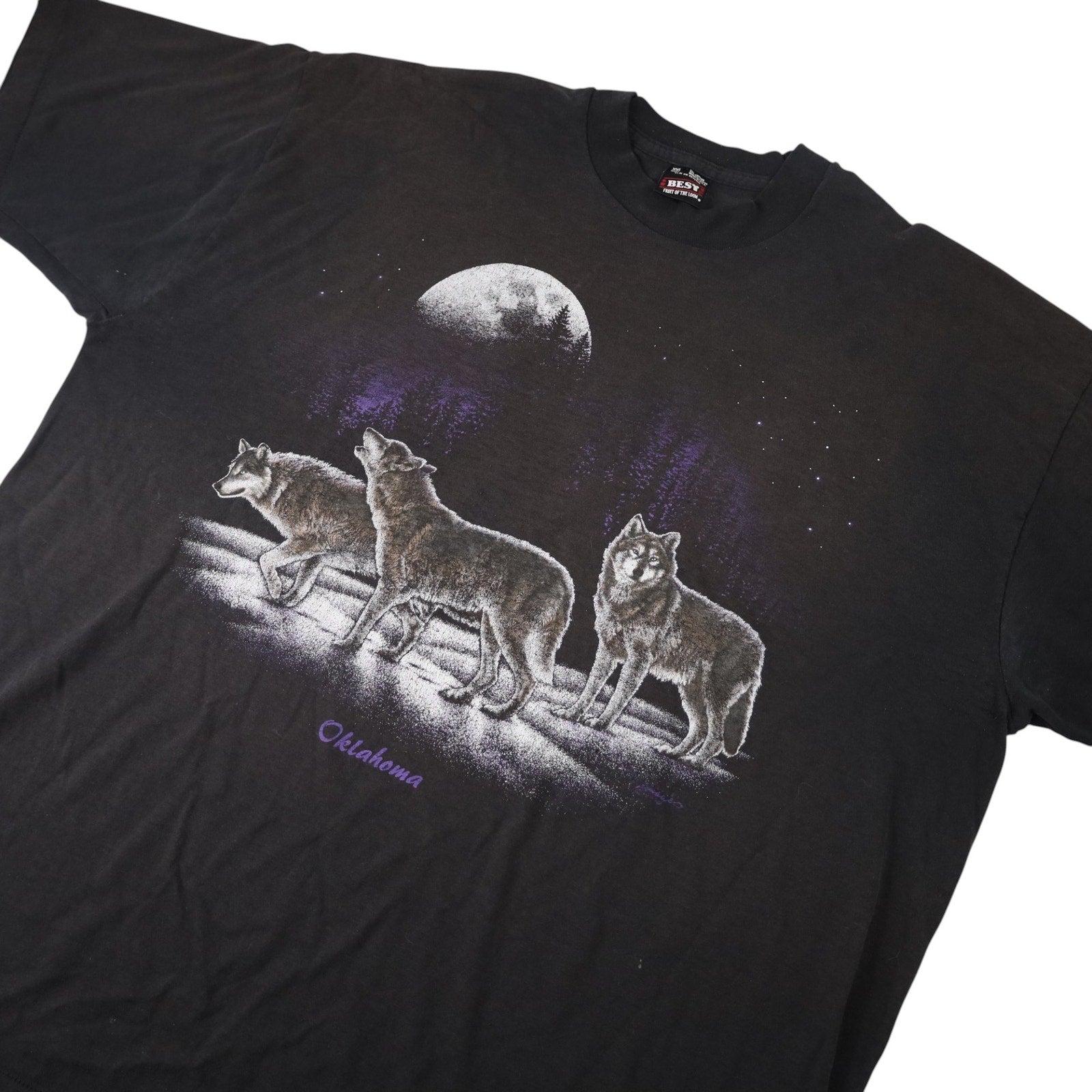 Vintage Wolf Night Scene Graphic T Shirt. Printed on USA made, single stitched, Fruit of the Looms Best. Faded to perfections.
