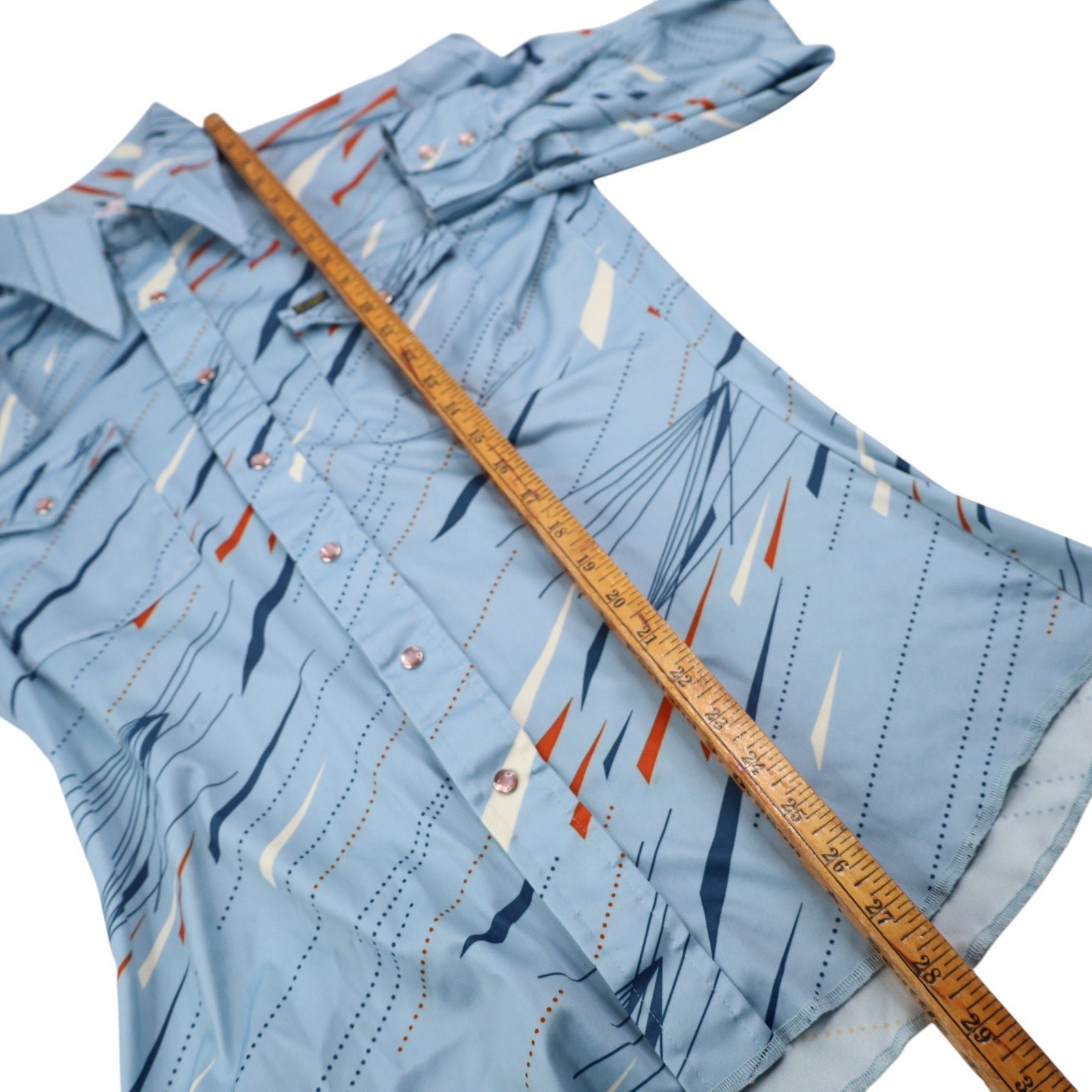 Vintage Wrangler MCM Design Polyester Pearl Snap Shirt. USA made, has the quality materials and construction to match. In excellent overall condition, no notable imperfections.